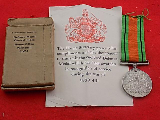 . WW11 Defence Medal in named box of issue, maned to Mr A Rogers 38 Selby Rd, St George, Bristol 5, with slip, good condition
